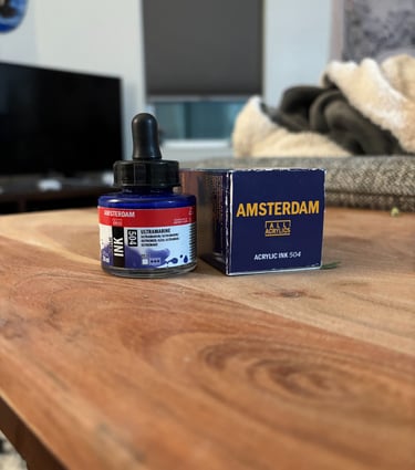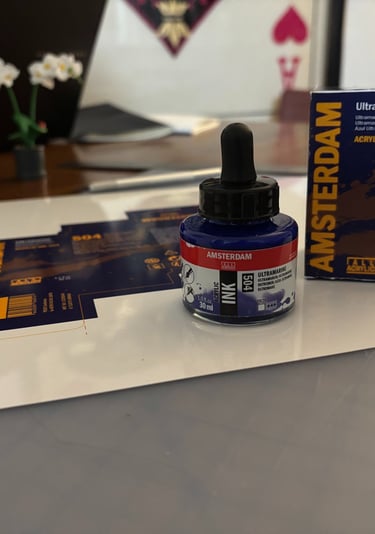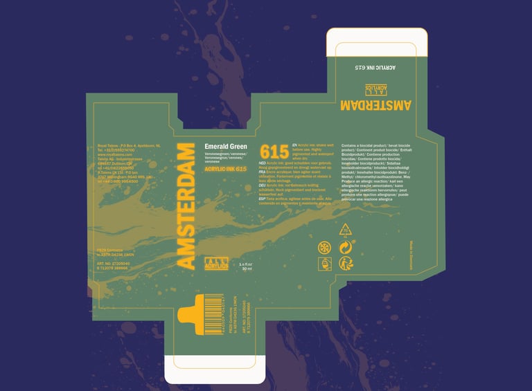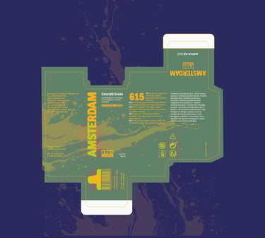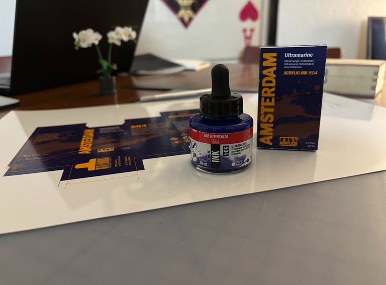One of the main challenges in this project was that Amsterdam All Acrylics doesn’t design packaging for a single ink bottle, but rather for a set of six. Creating a box meant for just one bottle pushed me to rethink the structure, proportions, and overall presentation. While it was challenging to adapt a system that wasn’t originally intended for individual units, it ultimately gave me more freedom to highlight and express the personality of a single color in a more focused and intentional way.