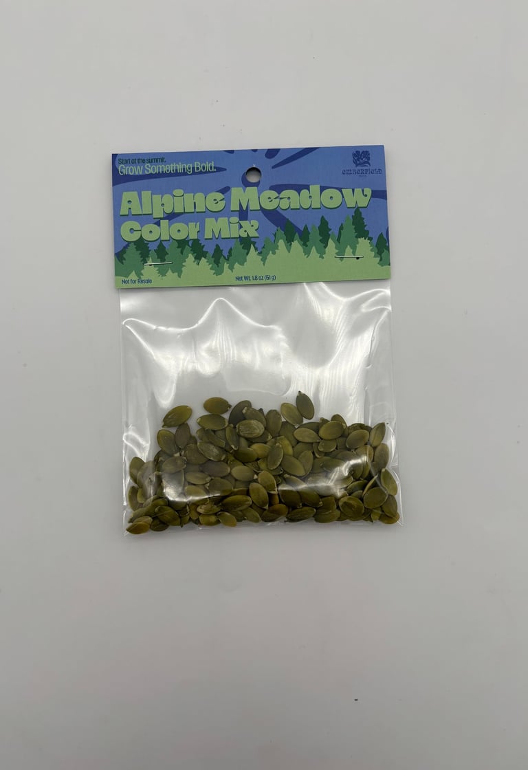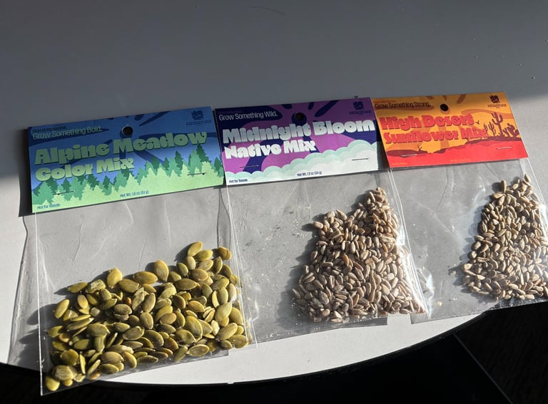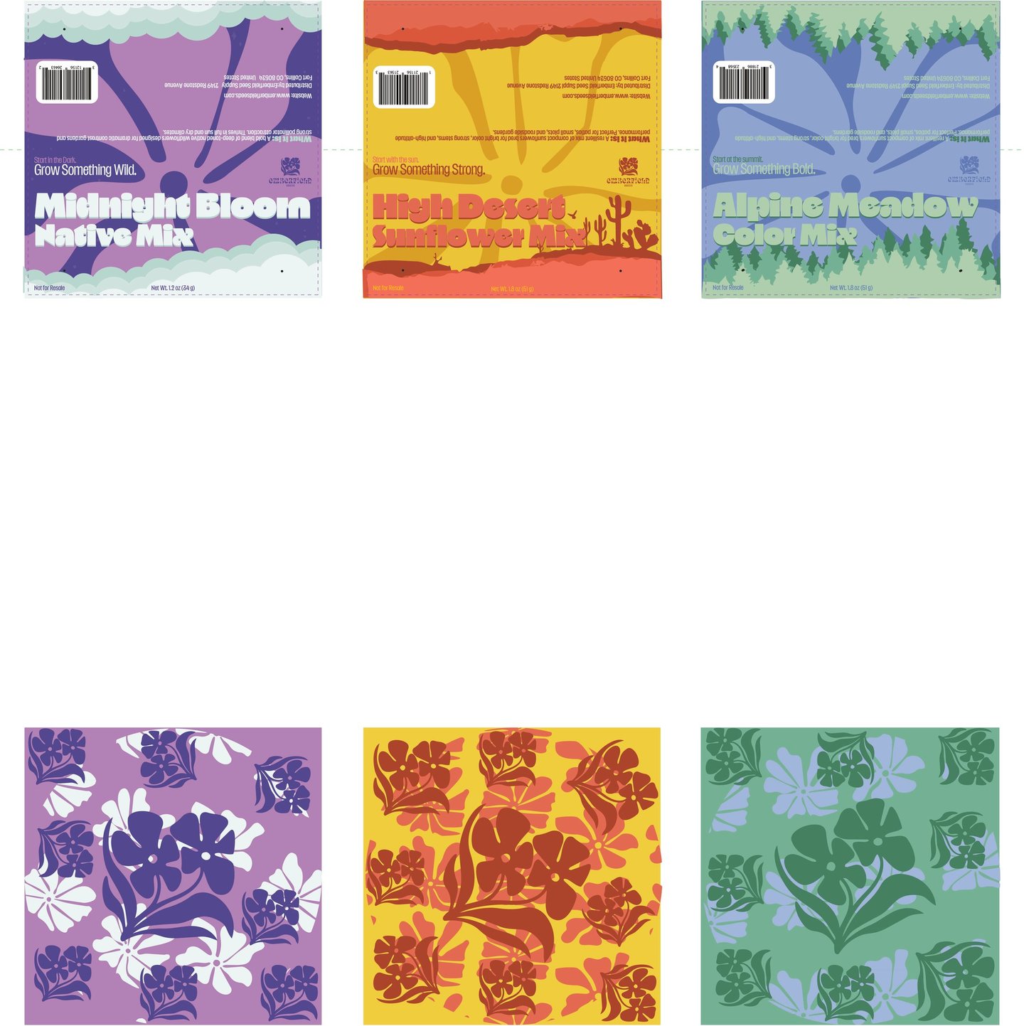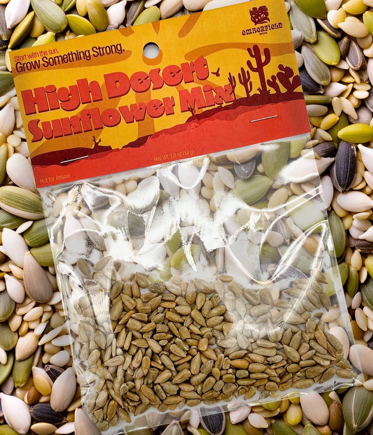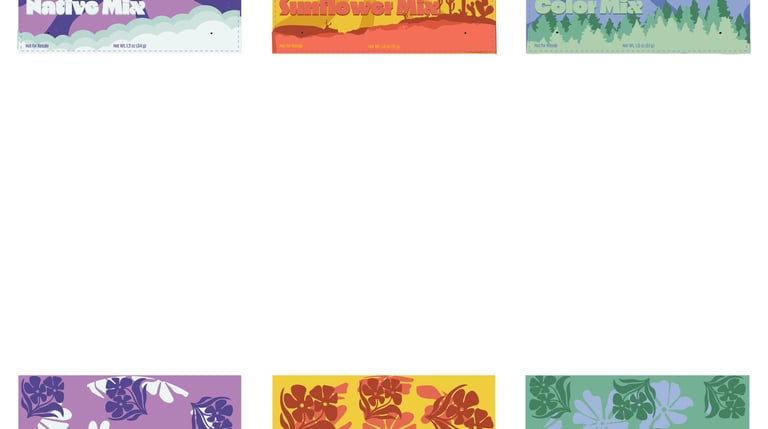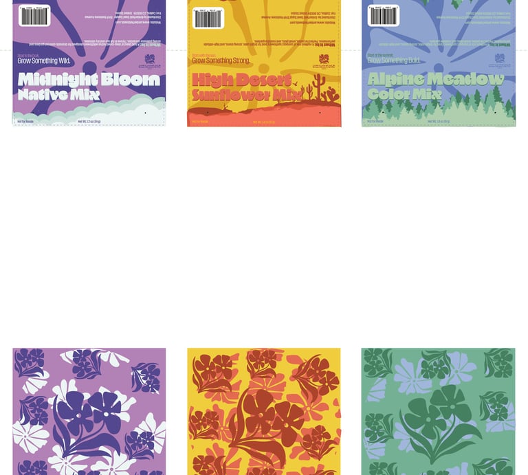 For the Header project, I designed three product headers for small plastic seed bags. I created a fictional seed brand and developed three different varieties: Alpino Meadow, Midnight Bloom, and High Desert Sunflower. Each header was designed to visually reflect the character of the seed variety while still feeling like part of the same product line. The project involved creating the designs, printing them, and assembling physical mockups to see how the headers function and appear in a real packaging context.